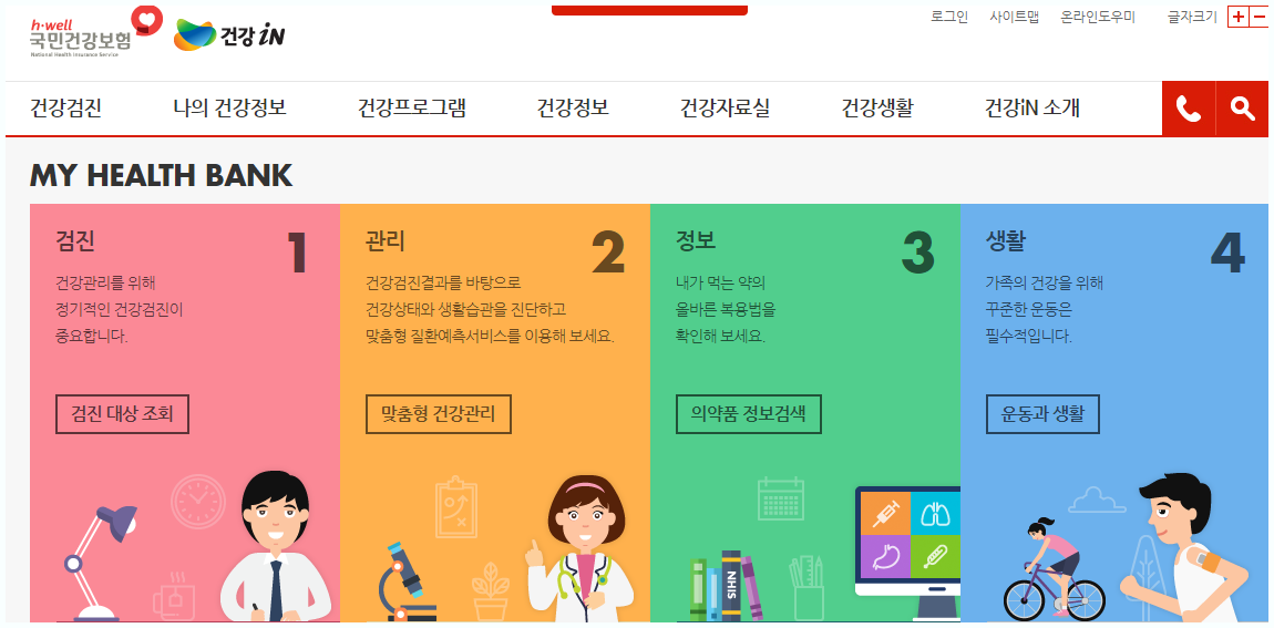 이러한 화면이 건강in에 나올겁니다 거기서 제일첫번째 1번에 있는 검진 대상 조회를 클릭해주세요 프로그램 설치를 모두 완료후 공인인증서로 로그인해주고 주민등록번호와 공인인증서를 통해서 로그인해줍니다