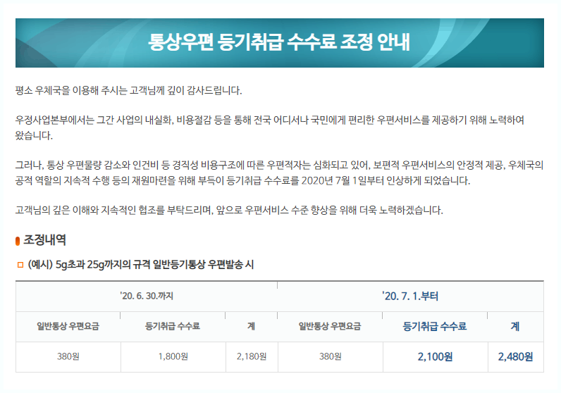 일반우편은 그대로지만 등기우편은 2020년 7월부터 가격이 상승하였습니다 참고하시기 바랍니다 5g초과 25g까지의 규격 일반등기통상 우편입니다