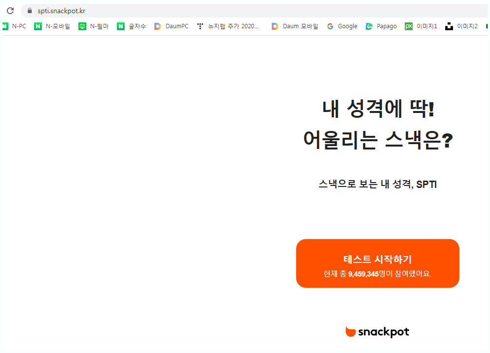 접속을 하게되면 이런화면으로 넘어갑니다 내셩격에 딱 어울리는 스낵은 이라는 스낵으로 보는 내성격 테스트라고 알수가 있는데요 이테스트에 참여한 사람이 벌써 900백만명이 넘는다고 하니 얼마나 많은 사람이 성격테스트를 즐기는지 알수있었습니다