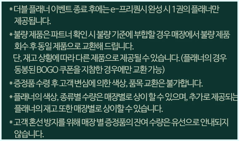 더블플래너 이벤트 기간동안 매장에 방문해서 오나성된 e-프리퀀시 바코드 또는 프리퀀시 증정품 교환 쿠폰을 제시하게되면 e-스티커 차감 또는 증정품 교환 쿠폰 사용후에 플래너를 증정하니 꼭 챙겨가시길 바랍니다 주의사항으로는