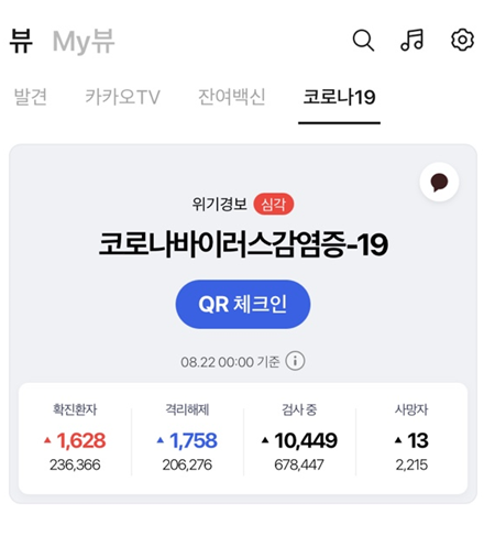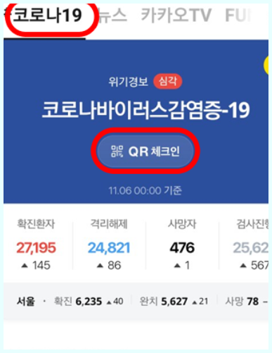 #버튼 누르면 이동하는 화면에서 코로나 19 라는 상단의 메뉴를 클릭해주세요 그후 뜨는 화면에서는 코로나 바이러스 감염증에 걸린 환자들의 상태를 보여주고 있는 화면이 나옵니다 여기서 빨간색으로 표시한 QR체크인을 클릭해주세요