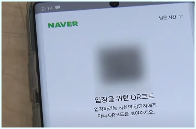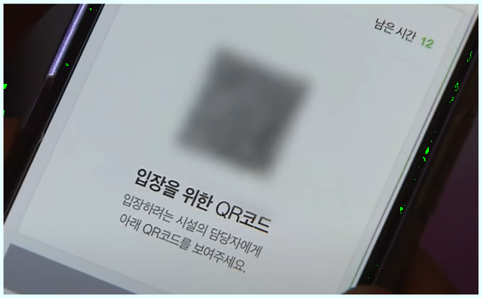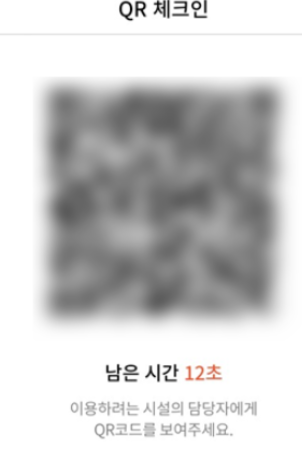 화면에서처럼 인증번호를 시간안에 입력해달라는 창이 뜹니다 인증번호를 넣어주시고 확인 버튼을 눌러주세요 qr코드 체크인이 나오면서 남은시간을 표시하며 QR코드가 생성됩니다 남은시간은 소진시 보안을 위해 QR코드 모양이 변합니다 생성된 QR코드를 시설 담당자에게 보여주시면 완료됩니다