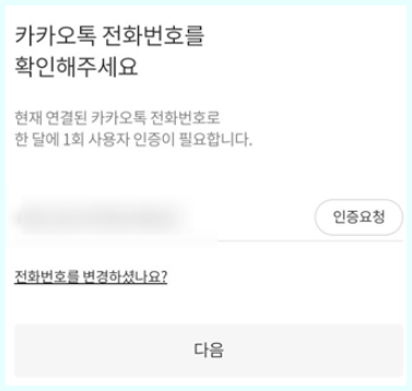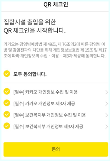 이처럼 집합시설 출입을 위한 QR코드 체크인을 시작한다고 나오며 동의를 요구하는 카카오톡QR코드 인증이 나옵니다 동의를 눌러주세요 그다음 나오는 화면에서 본인이 현재 쓰고 있는 전화번호를 입력해주세요 그후 인증요청을 해주시면 인증 문자가 핸드폰으로 전송됩니다
