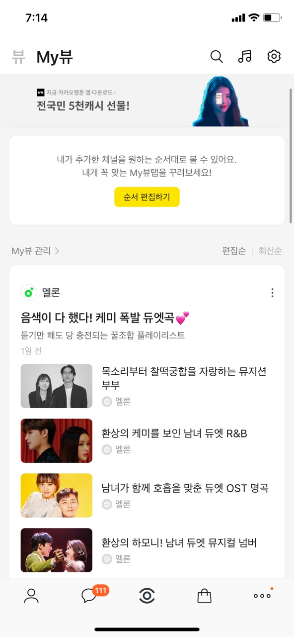 신버전은 아래에서 보면 가운데 눈모양이 있을겁니다 아래 사진과 같은 문양을 누르시면 새롭게 생긴 카카오 뷰라는 메뉴로 이동하게 됩니다