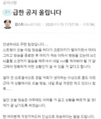 감스트는 방송종료후에도 계속해서 머리가아파서 병원을 갔다고 합니다 병원에서는 뇌진탕인것 같다고 해서 입원을 해서 방솔이 어렵다고 공지를 올렸습니다 전에는 요로결석으로 고생을 했는데 이번에는 뇌진탕이라 관계자들도 비상인것 같습니다