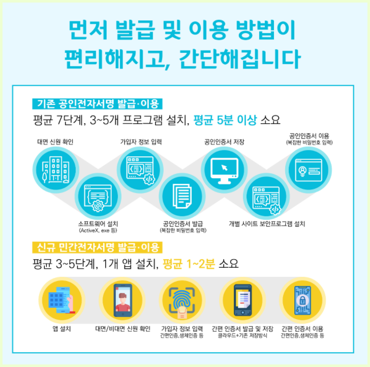 특징으로는 평균 5분이상이 소요되는데 신규 민간전자서명은 평균 발급시간이 1~2분정도가 소요됩니다