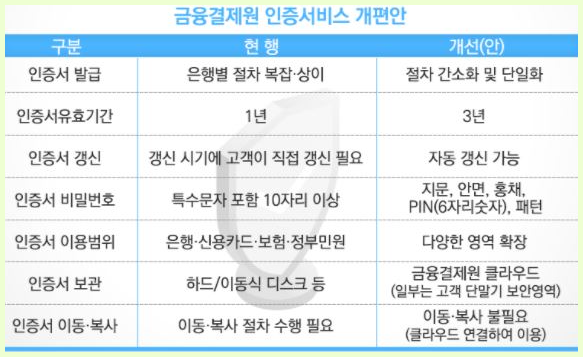공인인증서는 1년이라는 유효기간을 가지고 있지만 갱신까지해야합니다 하지만 새로도입되는인증서는 자동갱신과 3년이라는 긴 유효기간을 가지고 있습니다