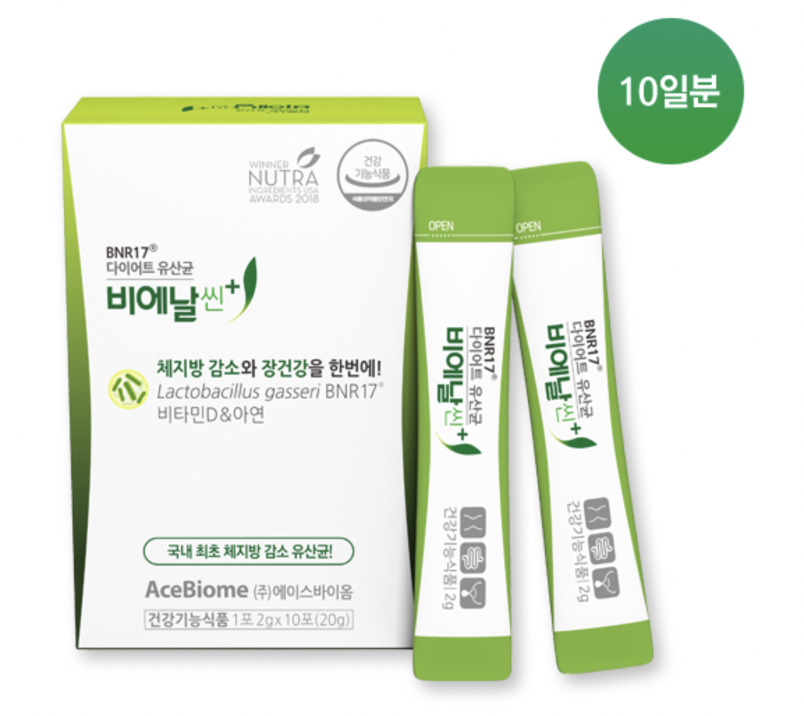 또한 이 유산균에는 비타민D도 포함되어 있어서 골다공증등 뼈 건강을 생각하시는 분들에게 도움을 주며 같이 있는 아연성분은 면연기능강화에 도움을 준다고 합니다 비에날씬 락토바실러스 가세리 BRN17은 유상균 100억마리 보장균수를 가지고 있으며 국내 뿐아니라 유럽 미국 중국 등 체중관리 유산균으로 인정받았습니다 국내에서는 식약처 인증을 받았습니다