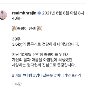 미쓰라는 자신의 공식 SNS계정을 통해서 2021년 6워 ㄹ8일 아침 8시 40분 뿜뿜이 탄생이라는 글을 남기며 득남의 기쁜 소식을 전했습니다 이어 미쓰라는 39주 3.6kg 몸무게로 건강하게 태어났습니다 지난 10개월 온전히 뿜뿜이를 위해서 자신의 몸과 마음을 아낌없이 희생했던 사랑하는 권다현 씨 진심으로 존경합니다 라고 자신의 아내에게 고마움을 전했습니다