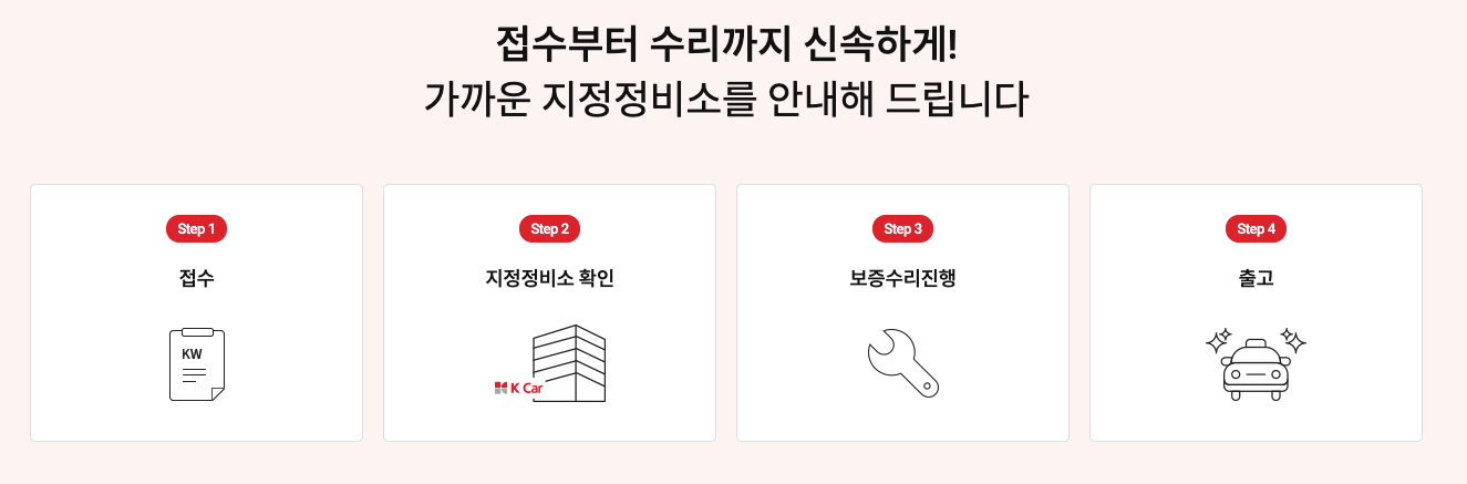 - 보증수리 접수 후 7일 이내 입고하셔야 하며, K Car 지정 정비업체에서만 수리 가능합니다.