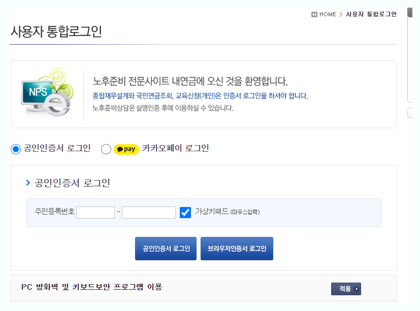 여기서 예상연금액 조회 서비스를 누르게되면 공인인증서 로그인으로 로그인해서 나의 연금액을 알수 있습니다 공인증서 또는 카카오페이로 로그인이 가능합니다 참고하시기 바랍니다 주민번호도 필요합니다
