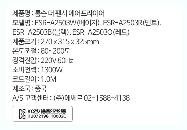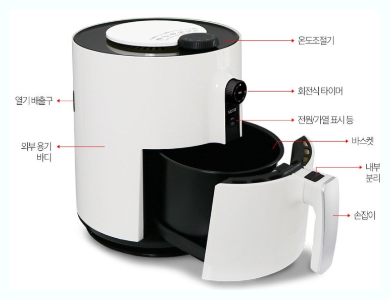 여성분들이 좋아하는 디자인과 색상이 눈에 띄는 제품입니다 총 컬러는 네가지 베이지 민트 블랙 레드가 있습니다 나선형 공기 순환기술 알루미늄 바스켓 이중구조 냄비형식에 공기통풍구 온도조절기능 타이머 다이얼기능 식기세척기로도 세척이 가능한 제품으로 나옵니다