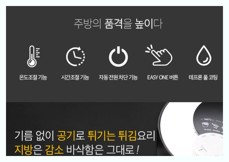 주요제품 성능으로는 온도조절은 80~200도 조절이 가능하며 타이머는 최장 30분 설정이 가능합니다 타이머가 0으로 돌아오면 자동정지되는 모드 입니다 거름망 역활을 하는 바스켓 그리고 팬이 분리가 되는 형식이며 테프론 코팅을 하여서 높은온도에도 인체에 무해하며 식기세척기를 사용할수 있는 구조입니다 가격은 55200원정도에 판매를 하고 있네요 제품상세는 아래를 참고하세요