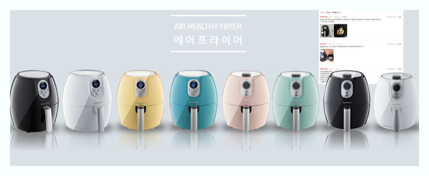 대우에서 만든 제품으로 2.6L용량 입니다 80~200도까지 온도 조절이 가능하며 최대 30분 시간조절 타이머가 있습니다 리뷰에는 용량과 가격대비가 좋다는 평가입니다 회사측에서는 누적판매량이 42만대라는걸 강조하고 있습니다 다양한 색상으로 소비자의 선택이 폭이 더 넓습니다
