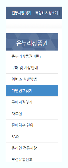 우선 소상공인시장진흥공단에서 운영하는 "전통시장 통통"을 검색하세요 그러면 사이트하 하나나오게 됩니다 많은 목록중 온누리상품권을 클릭하시면 이러한 메뉴들이 나옵니다 여기서 가맹점포 찾기를 하시면 어디서 사용할수 있는지 볼수 있습니다
