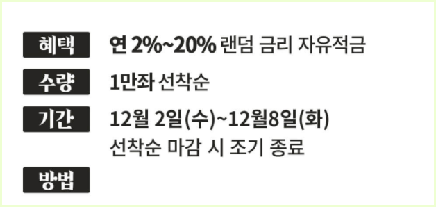 수량으로는 1만좌이며 선착순입니다 즉 2일부터 시작했지만 1만계좌가 모두 달성되면 끝난다는 의미니 빨리 신청해야 합니다 또한 기간이 있습니다 12월 2일 수요일부터 12월 8일 화요일 까지입니다 선착순 마감시 조기종료입니다