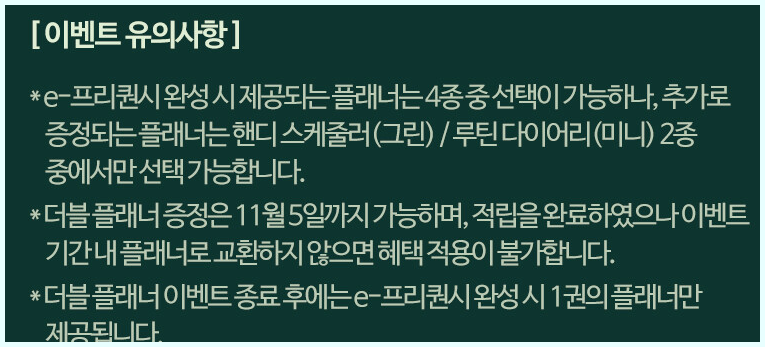 더블플래너 이벤트 기간동안 매장에 방문해서 오나성된 e-프리퀀시 바코드 또는 프리퀀시 증정품 교환 쿠폰을 제시하게되면 e-스티커 차감 또는 증정품 교환 쿠폰 사용후에 플래너를 증정하니 꼭 챙겨가시길 바랍니다 주의사항으로는