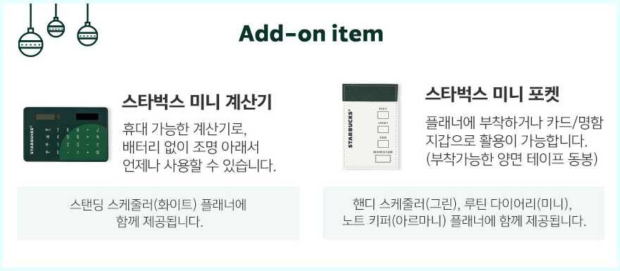 스탠딩 스케줄러 화이트에 함께 제공되는건 스타벅스 미니 계산기입니다 특징으로는 배터리없이 조명아래에서 사용할수 있다는 점인데요 태양열 판이 붙어있는것으로 보입니다 스타벅스 미니포켓은 핸드스케줄러 루틴다이어리 노트키퍼와 함께 제공되는 포켓지갑으로 플래너에 부착하거나 지갑으로 활용이 가능합니다 자그럼 크로스백을 살펴보겠습니다