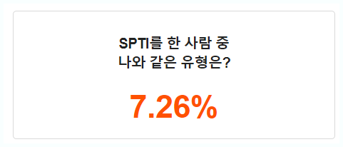 이대로 평가를 보자면 내성적인 외골수 성격인것 같네요 자신의 단점이나 장점이 여기서 보인다면 보완해서 좀더 멋진 성격으로 탈바꿈할수있는 테스트인것 같습니다 저와 똑같은 SPTI유형은 검사받은 사람중에 7.26%나 된다고 하네요