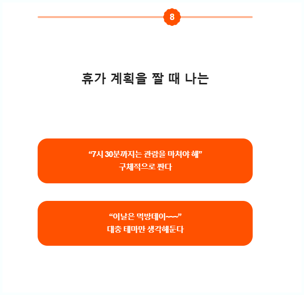 다음 질문으로는 휴가계획을 짤때 나는 이라는 질문인데요 전 먹방데이라는 말이 공감가네요 어떻게 밥을 먹을지만 정하고 두루뭉실하게 놀게 있으면 놀아서 대충 테마만 생각해둔다를 선택했습니다