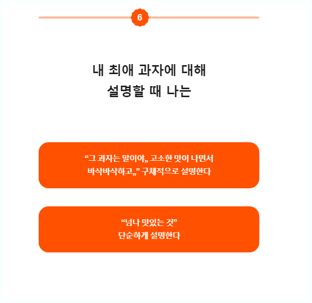 다음질문도 재미있네요 최애과자를 설명할떄 어떻게 하는지 전 길게 말하는걸 싫어해서 그런지 맛있다고 단순하게 설명하고 직접 느껴보라는 식이라 두번째를 선택했어요