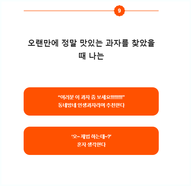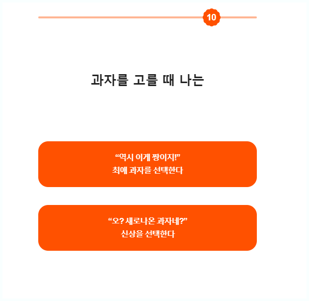 거의 마지막 질문에 다다르고 있네요 과자를 고를때는 신상을 많이 선택하는 편입니다 새로운맛 때문에 실망하기도 하지만 새로운맛을 보다가 맛있는 맛을 찾는 재미도 있으니까요