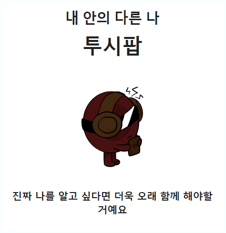 저는 내안의 다른나 투시팝이 나왔습니다 진짜 나를 알고싶다면 더욱 오래 함께 해야할 거예요 라는 문구가 눈에 띄네요 제가나온 투시팝을 설명드리겠습니다