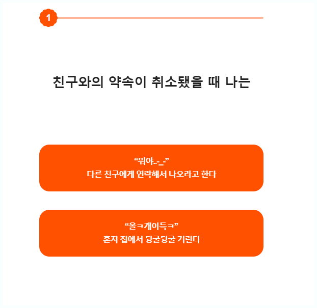 테스트 방법은 아주 간단합니다 스낵으로 보는 내 성격 SPTI 아래 주황색 버튼 테스트 시작하기를 선택합니다 이러한 화면이 나오는데요 번호 1번이 나오며 테스트가 바로 시작됩니다