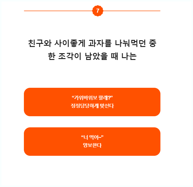 친구와 사이좋게 과자를 나눠먹던중 한조각이 남았을때 라는 질문으로 넘어가는데요 전 양보합니다 여러분들은 어떤 선택을 하셨을까요?