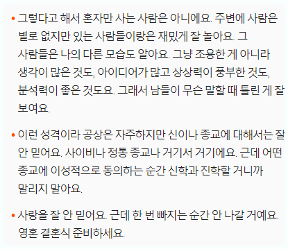 아 세번째는 반박할수 없네요 굳이 같이 안놀아도 세상엔 할게 많다는거 공감합니다 가는사람 안붙잡고 오는사람 안막는 성격은 맞는것 같네요 저만의 시간이 필요한 타입이거든요