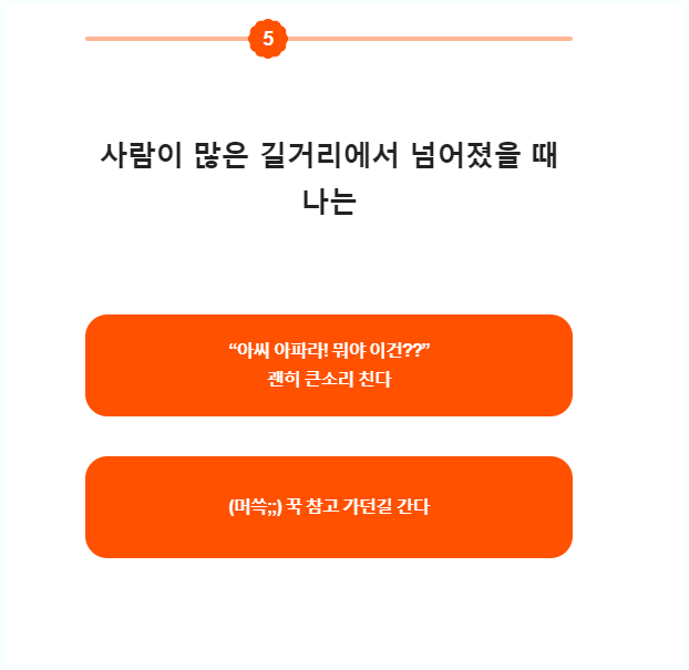 인정하긴 싫지만 전 벼락치기 파입니다 그렇다고 성적이 높은것도 아니었네요. 바로 다음테스트로 넘어가죠 다음질문은 사람이 많은 길거리에서 넘어졌을 때 나는 이라는 질문에서 전 꾹 참고 가던길을 갑니다