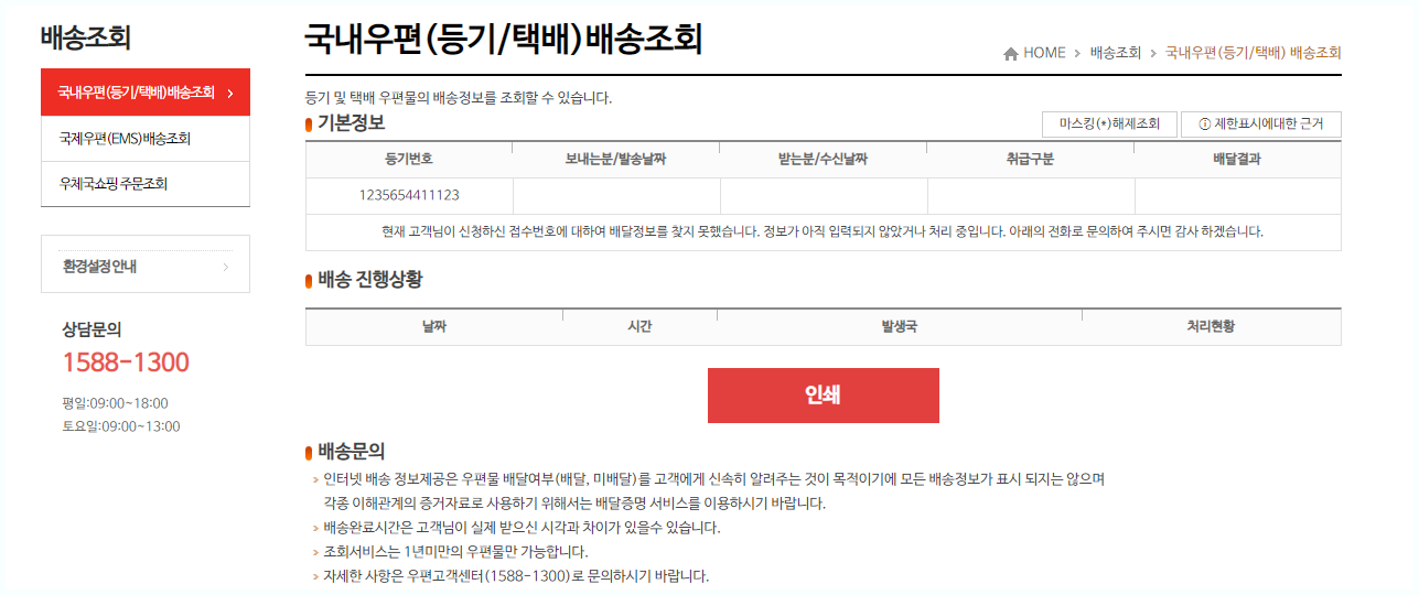 자 화면에서 보시면 배송조회 등기번호로 조회 부분이 나옵니다 이 입력창에서 등기번호를 13자리 가지고 있으실텐데요 조회를 하게되면 등기번호에 따른 배송조회가 나오게 됩니다
