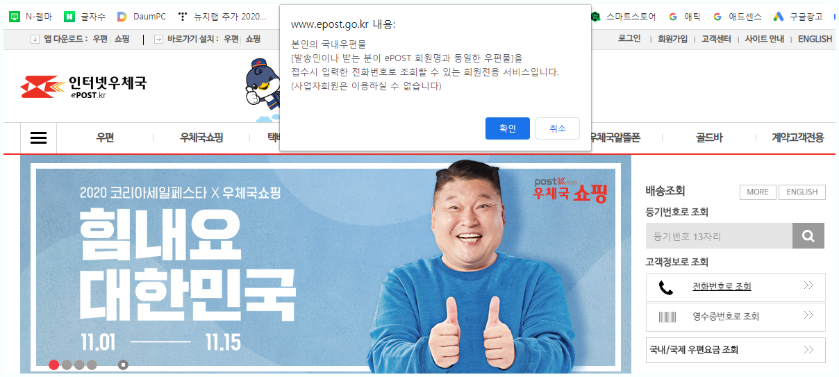 그외에도 전화번호 조회와 영수증번호로 조회방법이 있습니다 전화번호조회는 본인의 국내우편물 즉 발송인이나 받는분이 ePOST 회원명과 동일한 우편물을 접수시 입력한 전화번호로 조회할수있는 회원전용 서비스이므로 가입을 해야 조회를 할수가 있습니다