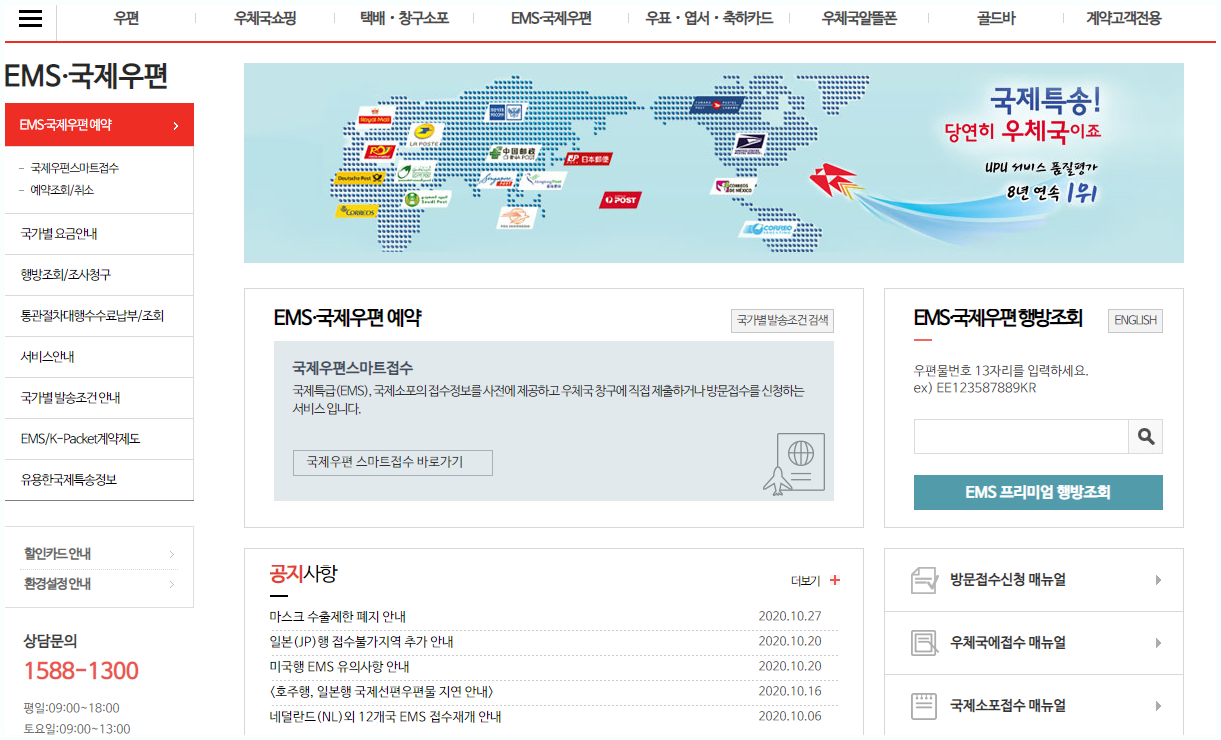 EMS 국제 우편조회방법은 인터넷우체국으로 접속한뒤 맨위 메뉴창에서 EMS 국제우편을 선택하시면 됩니다