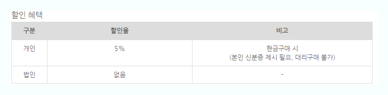 할인혜택은 개인이 구매시에만 해당되며 5%할인을 받아서 상품권을 구매할수 있습니다 즉 5만원짜리 상품권을 구매한다면 5%할인받아 현금으로 상품권을 사는가격은 2500원 5% 할인을 받아 47500원에 상품권을 구매할수 있다는 이야기입니다