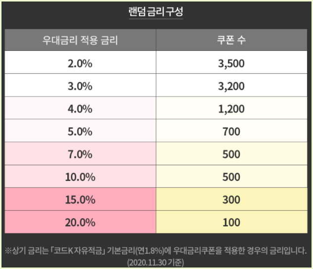 그후 케이뱅크 앱설치후 코드K자유적금 가입하기를 눌러주세요 선택화면에서 당첨된 금리를 선택후에 코드를 입력하셔야 하며 쿠폰은 반드시 12월 8일까지 사용하셔야 합니다 대출받기도 힘든 시기 이처럼 멋진 고금리 랜덤이긴 하지만 20% 짜리 적금을 어디서 찾아볼수 있겠어요 금리별 쿠폰수도 남기도록 하겠습니다 케이뱅크 고금리 적금 꼭 신청하세요