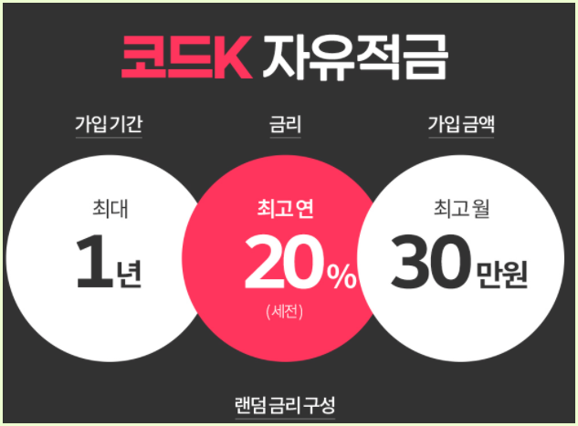 | 케이뱅크 혜택존 최대 20% 금리 혜택존 설명 바로가기 | 코드K 자유적금 최대 20% 적금 가입하기 바로가기 |