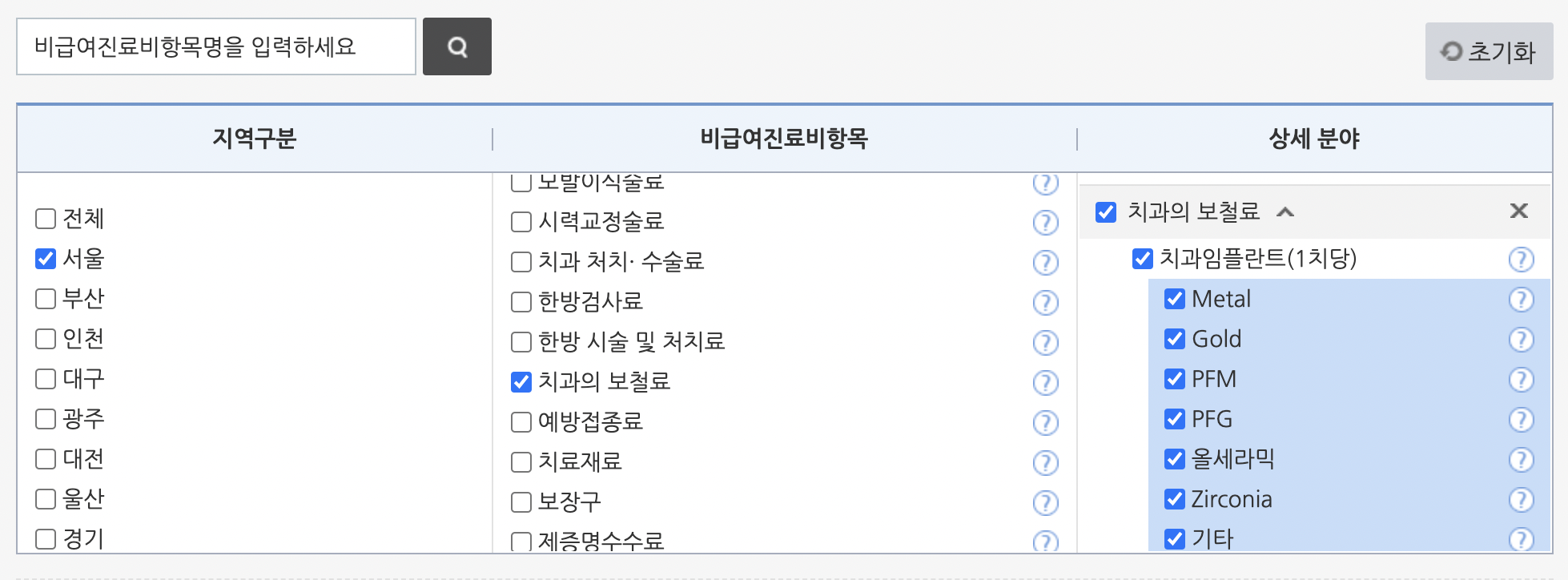 이화면에서 해당지역을 체크하세요 전 서울을 선택하겠습니다 [서울]→[치과의 보철료]→치과의 보철료 상세 설명에서 해당 시술내용을 선택하세요 전 전체적인 골드 메탈 올세라믹 등 모든 임플란트 가격을 보기위해 선택하였습니다 아래그림 참조