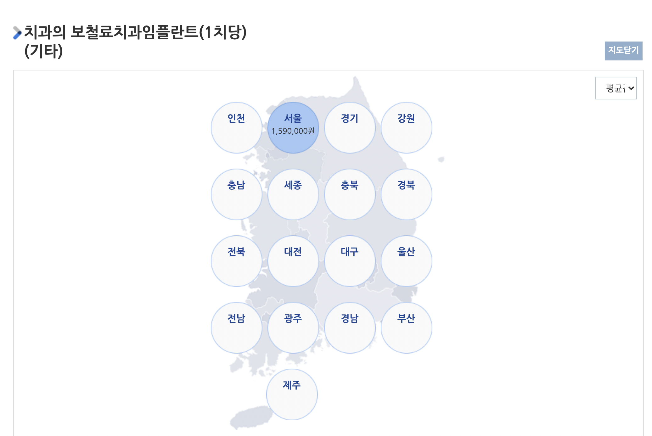 이렇게 선택후 검색 버튼을 눌러주게 되면 화면이 이동하게 됩니다 지역별로 치과 임플란트 비용의 평균가와 최저 최고가를 모두 확인할수 있습니다 이 금액을 기반으로 임플란트 할려는 곳의 치료비를 비교하시면 됩니다
