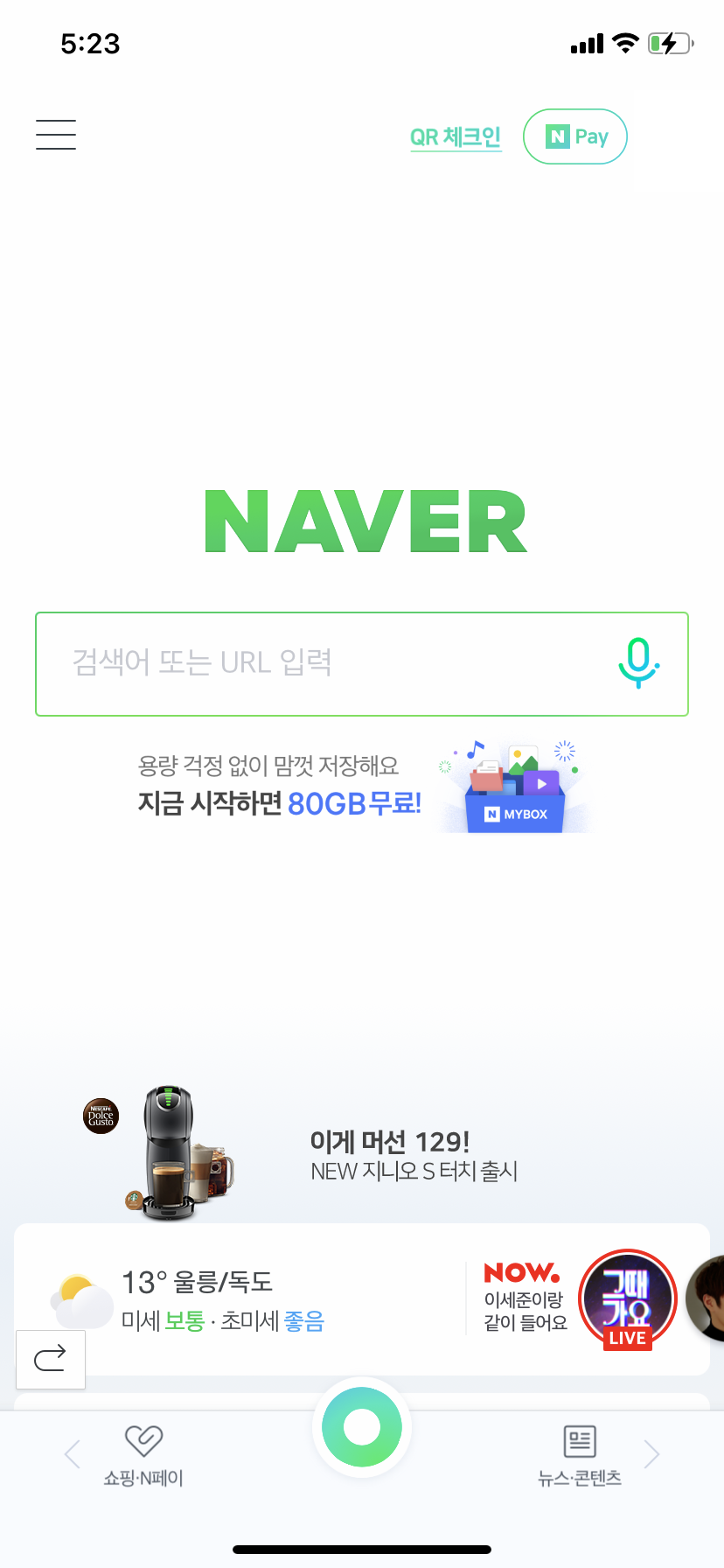 네이버는 우선 네이버 어플이 설치되어있어야 합니다 스토어앱에서 네이버를 다운 받으신후 로그인을 먼저 해주세요 그후 네이버에 접속하면 이러한 화면이 나오게 됩니다 초기화면이기도 합니다