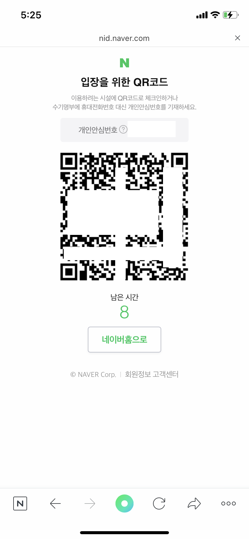 그후 본인인증을 하라는 창이 뜨면서 자신의 핸드폰번호를 넣고 본인인증 절차를 진행하시면 됩니다 본인 인증이 완료되면 아래와같이 qr코드가 생성이 되어 사용하시면 됩니다 보안을 위해 제코드는 몇개 지웠습니다 보시면 개인안심번호와 qr코드 두가지가 나오게 됩니다