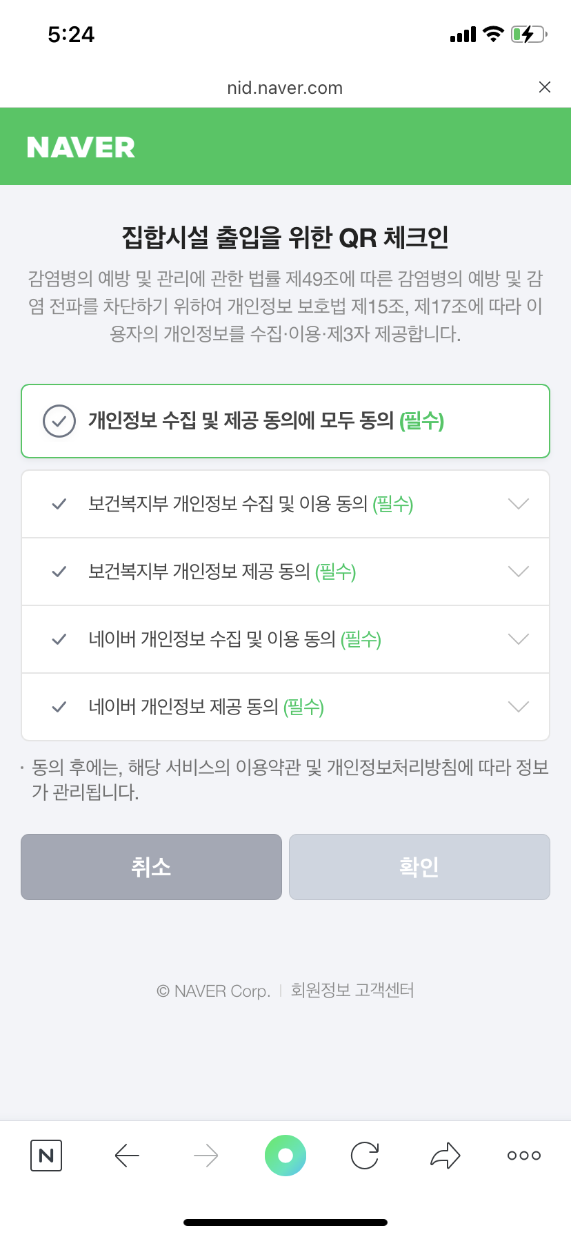 이러한 집합시설 출입을 위한 qr체크인이라고 뜨며 동의를 구하게 됩니다 모두 동의를 해주고 확인버튼을 눌러주세요