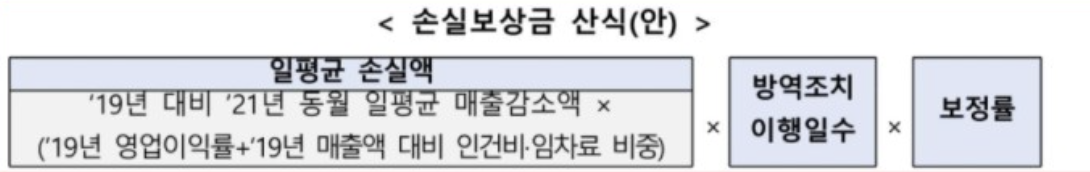 손실보상금은 코로나 19 영향이 없었던 19년대비 21년 동월 일 평균 손실액에 방역조치 이행기간과 보정률을 적용하여 산정하는 방식입니다