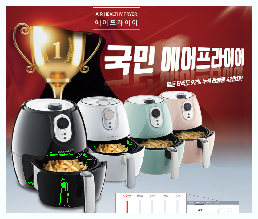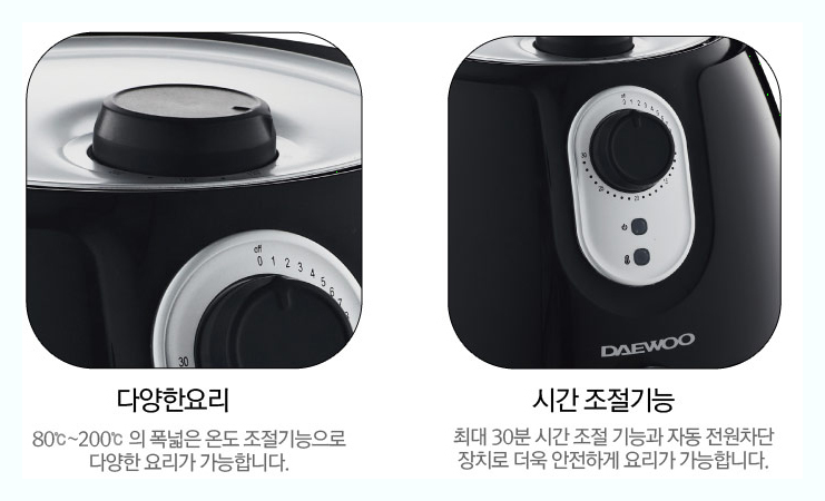 대우에서 만든 제품으로 2.6L용량 입니다 80~200도까지 온도 조절이 가능하며 최대 30분 시간조절 타이머가 있습니다 리뷰에는 용량과 가격대비가 좋다는 평가입니다 회사측에서는 누적판매량이 42만대라는걸 강조하고 있습니다 다양한 색상으로 소비자의 선택이 폭이 더 넓습니다