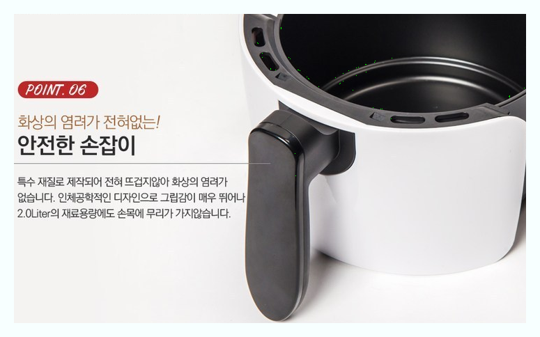 저렴한가격으로 쿠o에서 많이 팔린제품입니다 시간조절기능30분 온도는 80~200도 공기순환방식이며 대신 용량은 좀더작은 2.0리터입니다 기존에 많이 쓰는 2.6L보다는 작은 모델이라는걸 생각하셔야합니다 그만큼 저렴하구요