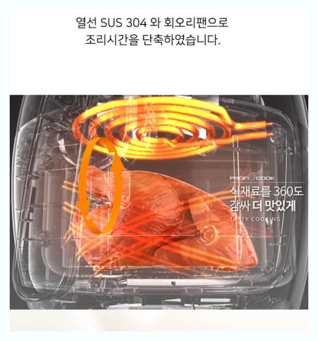 프로피쿡제품 또한 30분타이머 80~200도 온도조절이 가능한 에어프라이입니다 360도 회오리팬을 강조하는 제품입니다