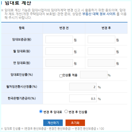 변경후 임대료을 선택해야 새로적용되는 인상률로 계산됩니다 그후 임대보증금 월임대료등 자신에게 있는 정보들을 입력후 계산하기를 눌러주시면 계산이 되어 나옵니다 인상률적용은 해제해줘야 합니다 작은 %차이에도 많은 차이가 있습니다
