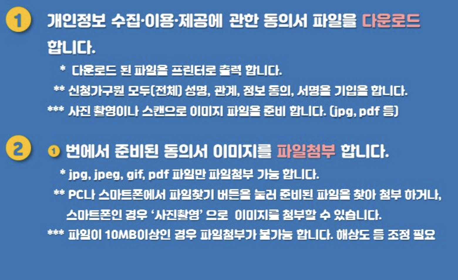 오프라인 신청은 온라인 신청이 마감된 후 해당 기관에서 직접 방문하시어 신청하시면 됩니다 근처 주민센터에 방문해서 신청서를 작성해서 받는 방식이 보편적입니다